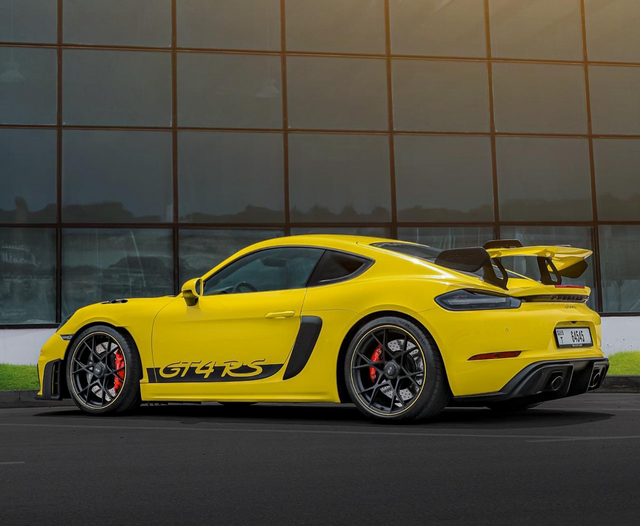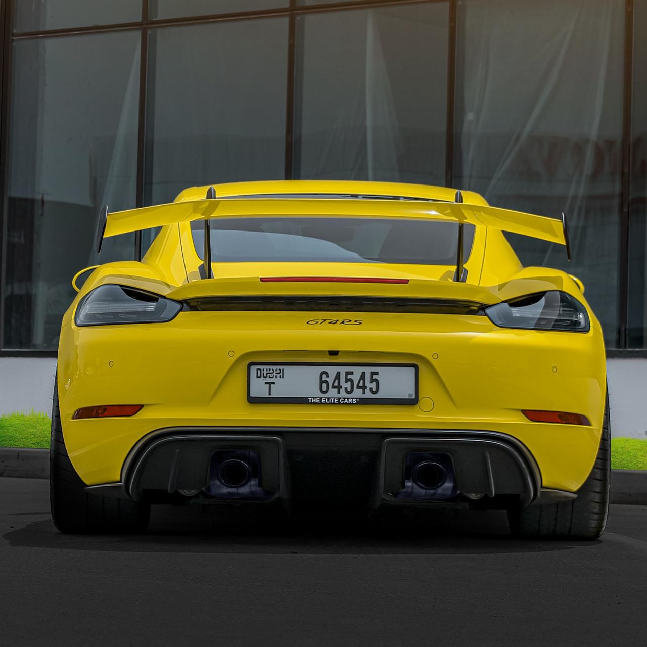 The Porsche 718 Cayman GT4 RS Yellow Sports Car is listed by Drive Square Car Rental. This 2-door Luxury Car fits 2 passengers and 1 medium-sized bag(s).